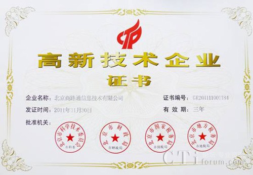 CTI論壇(ctiforum)3月23日消息(記者 浩宇):商路通再傳喜訊,2012年3月12日商路通獲得了“國(guó)家級(jí)高新技術(shù)企業(yè)”證書(shū),(證書(shū)編號(hào):GR201111001184,有效期三年),這標(biāo)志著商路通發(fā)展的又一個(gè)新的里程碑。