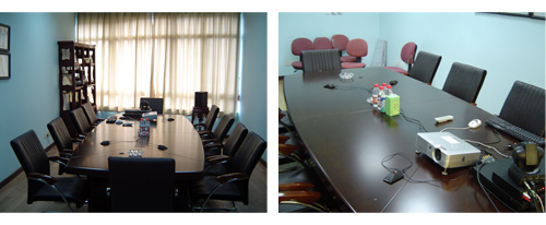 這是在一間典型的會(huì)議室中使用audec多媒體語(yǔ)音引擎做視頻會(huì)議回音消除的測(cè)試。會(huì)議室是一個(gè)5M*3M*3M大小的空間,3面墻是水泥墻,沒(méi)有裝飾,屋頂是不帶孔的光滑吊頂,另外一面是玻璃,地板是實(shí)木復(fù)合地板,所以整個(gè)會(huì)議會(huì)議室內(nèi)的回聲反射比較強(qiáng)烈,并且我們還在會(huì)議室內(nèi)安置了分別指向不方向的四個(gè)高靈敏度介面麥克風(fēng)。