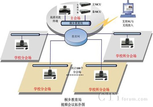 作為浙江省的教育強市,桐鄉(xiāng)市教育局下屬有各級各類學(xué)校近百所,隨著學(xué)校規(guī)模的日益擴大,以及教育信息化進(jìn)程的推進(jìn),桐鄉(xiāng)教育局需要構(gòu)建遠(yuǎn)程教學(xué)交流平臺,以實現(xiàn)資源共享。項目要求構(gòu)建的遠(yuǎn)程教學(xué)交流平臺能夠使教育局與各學(xué)校之間實現(xiàn)點對點、一點對多點、和多點群組視頻會議、遠(yuǎn)程課堂、課堂觀摩、互通教學(xué)等多種應(yīng)用。并且滿足以下需求: