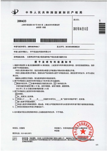 圖為: 互聯(lián)網(wǎng)應(yīng)用中減少服務(wù)器和客戶端業(yè)務(wù)通訊量的方法專利授權(quán)書(shū)