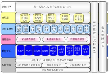 整個(gè)系統(tǒng)的底層是信息系統(tǒng)的基礎(chǔ)設(shè)施,這包括網(wǎng)絡(luò)及通訊設(shè)施、主機(jī)服務(wù)器及存儲(chǔ)系統(tǒng)、視頻會(huì)議系統(tǒng)、大屏幕數(shù)據(jù)演示系統(tǒng),以及操作系統(tǒng)、數(shù)據(jù)庫(kù)管理系統(tǒng)及網(wǎng)絡(luò)通訊基礎(chǔ)設(shè)施等,這些是系統(tǒng)最基本的運(yùn)行基礎(chǔ)。