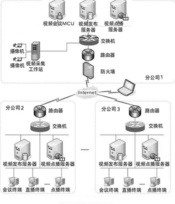 旺城國際控股集團(tuán)視頻會議系統(tǒng),其Internet出口帶寬為10M,因?yàn)樵摮隹谶要傳輸各種業(yè)務(wù)數(shù)據(jù),所以實(shí)際用于視頻會議的帶寬大概在5M左右,各分公司的接入速率在384Kbps~768Kbps之間。方案采用一臺高性能服務(wù)器作為MCU,以確保支持五會場的遠(yuǎn)程接入。同時(shí),在五個(gè)分公司配置一臺直播服務(wù)器,支持各地Intranet(均為100M帶寬)內(nèi)的電腦用戶接收會議現(xiàn)場組播,并錄制、上傳到點(diǎn)播服務(wù)器備份以供會后研討。整個(gè)視頻會議的包括: