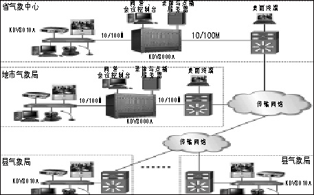 每個(gè)縣氣象局各部署一臺(tái)KDV8010A高清晰視頻會(huì)議終端,通過(guò)以太網(wǎng)接入到上級(jí)地市氣象局的KDV8000A多點(diǎn)控制單元。