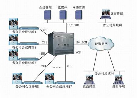 該系統(tǒng)基于蘇州科達公司KDV系列視頻會議產(chǎn)品,全網(wǎng)采用1套MCU、20套會議室型終端和200多套桌面型終端,其中會議室型終端通過2條E1線路捆綁與MCU相連、桌面型終端通過10/100M以太網(wǎng)和IP數(shù)據(jù)網(wǎng)與MCU相連?傮w網(wǎng)絡(luò)結(jié)構(gòu)如下圖所示: