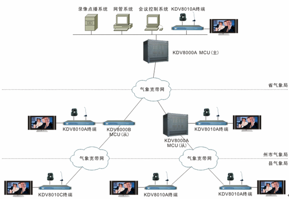 目前,一期工程已完成省到地市的建設(shè),系統(tǒng)設(shè)備全部基于科達(dá)KDV系列視頻會(huì)議產(chǎn)品。省氣象局部署KDV8000A多點(diǎn)控制單元1套,負(fù)責(zé)整個(gè)視訊網(wǎng)絡(luò)的交換和管理;省氣象局預(yù)報(bào)會(huì)商室與各州市氣象局預(yù)報(bào)會(huì)商室各部署KDV8010A高清視頻會(huì)議終端1臺(tái),提供本地會(huì)場(chǎng)視音頻信號(hào)的接入。州市氣象局的視頻會(huì)議終端通過(guò)氣象寬帶網(wǎng)接入省氣象局的多點(diǎn)控制單元。其中,KDV8010A支持H.239雙視頻流功能,可同時(shí)接入會(huì)議攝像機(jī)和電腦VGA信號(hào),并可同時(shí)輸出視頻信號(hào)和VGA信號(hào)到電視機(jī)和投影儀,實(shí)現(xiàn)與會(huì)者圖像和輔助視頻圖像的同時(shí)傳輸。