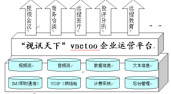 VNETOO視訊運營平臺具有強大的數(shù)據(jù)功能和優(yōu)質(zhì)的音視頻效果,是集"視頻+語音+數(shù)據(jù)+IM(即時通信)+VOIP(網(wǎng)絡電話)+計費+后臺管理"的基于IP網(wǎng)絡世界一流視訊服務提供平臺,它革命性地開創(chuàng)了視訊運營領域的全新模式。(見圖表一:"視訊天下"vnetoo運營平臺結構)。
