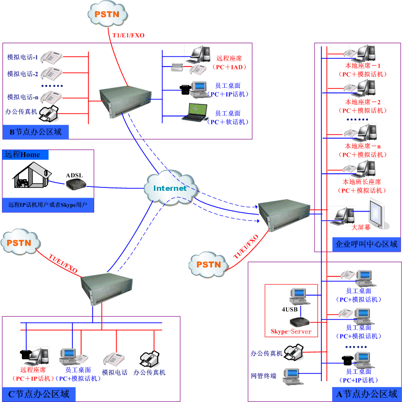 各區(qū)域內(nèi)部員工可以進行0話費的通話和傳真外,還可以非常輕松的實現(xiàn)長途旁路功能 (即長途費用變市話費用功能);同時每部分機同時具有一個真實的當?shù)厥性捥柎a和一個內(nèi)部分機號。