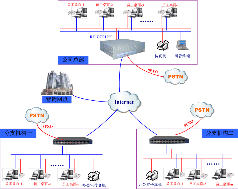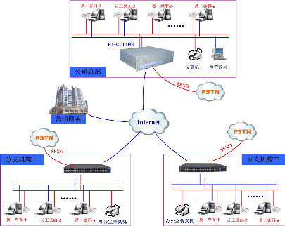 生產(chǎn)總部與分支機構、營銷網(wǎng)點實現(xiàn)統(tǒng)一辦公電話功能(即VOIP組網(wǎng)+辦公電話功能)。
