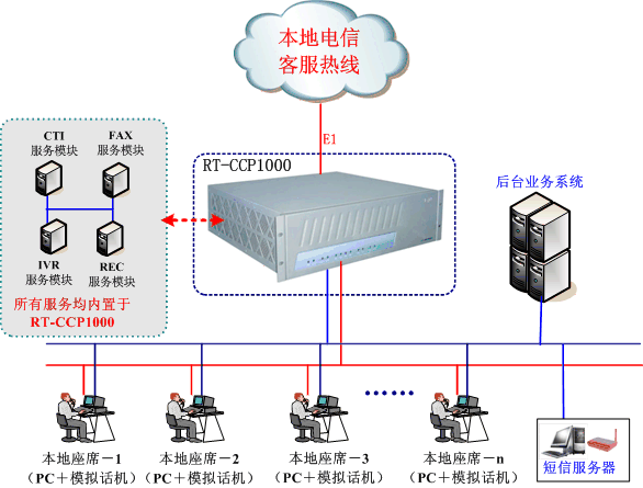 系統(tǒng)架構(gòu)簡單,CIT服務(wù)模塊、傳真服務(wù)模塊、IVR服務(wù)模塊、錄音服務(wù)模塊都內(nèi)置在RT-CCP1000內(nèi),從電信運營商接入1條數(shù)字中繼E1到RT-CCP1000,RT-CC1000提供20個人工座席10路VIR,同時支持語音、留言、傳真、短信、郵件方式,為申銀萬國客戶提供全方位的服務(wù)模式;提供業(yè)務(wù)系統(tǒng)接口與申銀萬國后臺業(yè)務(wù)系統(tǒng)無縫整合,實現(xiàn)呼叫中心系統(tǒng)與業(yè)務(wù)系統(tǒng)的緊密結(jié)合;為申銀萬國量身定制多款個性化的工單。維護界面采用全中文WEB方式,支持遠程維護,同時也支持遠程座席方式,為后續(xù)公司的發(fā)展打下了堅實的基礎(chǔ)。