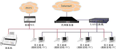 某中小企業(yè),無分支機構(gòu),現(xiàn)時有一個由傳統(tǒng)PBX構(gòu)建的電話系統(tǒng)和一個以太局域網(wǎng),兩者相互獨立,局域網(wǎng)通過一臺代理服務(wù)器用以太網(wǎng)或ADSL方式接入Internet。企業(yè)的語音通信由電話系統(tǒng)實現(xiàn);員工的日常工作需要使用計算機以及多種局域網(wǎng)和Internet服務(wù)。