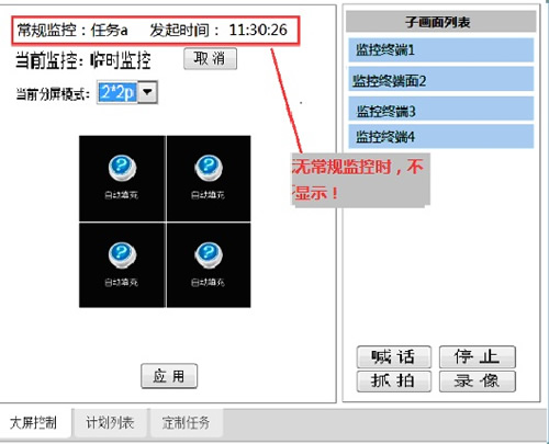 監(jiān)控任務(wù):用戶對(duì)一組監(jiān)控終端設(shè)置之后,會(huì)按其調(diào)置的時(shí)間點(diǎn)實(shí)施監(jiān)控。
