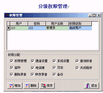 。。通話錄音或留言進(jìn)行查詢管理,可按日期、時(shí)間、電話號(hào)碼、線路、通話長度、人員等條件對(duì)錄音進(jìn)行快速檢索、播放,也可將錄音文件進(jìn)行刪除、標(biāo)記、轉(zhuǎn)存、備份等操作。分級(jí)權(quán)限管理