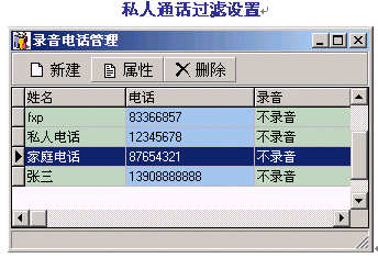 。。通過對(duì)某些特殊電話號(hào)碼的禁止錄音設(shè)置,DVS將自動(dòng)過濾該號(hào)碼進(jìn)行不錄音處理,以滿足私人通話及特殊場(chǎng)合的需要。