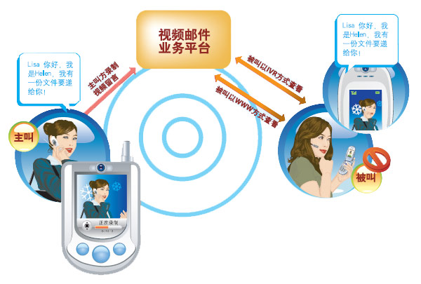 視頻郵件業(yè)務(wù)是在原有的語音郵件的基礎(chǔ)上又增加了極具個(gè)性化的視頻功能。即當(dāng)被呼叫方忙、在3G信號覆蓋區(qū)以外或是無法接聽時(shí)可以使用視頻郵件的功能。當(dāng)一個(gè)通話呼叫被切換到視頻郵件服務(wù)后,呼叫方首先將會看到一段視頻的歡迎信息,這可以是通過視頻片的方式預(yù)先錄制的個(gè)性化的視頻信息,也可以是預(yù)先設(shè)定的一個(gè)卡通形象。呼叫方可以錄下個(gè)人的視頻通話通過郵件方式傳遞給被叫。