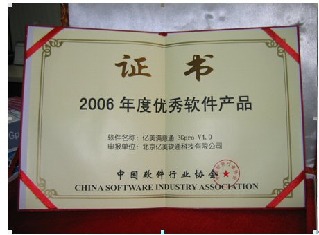 2006年1月18日,由中國軟件行業(yè)協會頒發(fā)的“2006年度推薦優(yōu)秀軟件產品”獎,經過層層評審,終于浮出水面。北京億美軟通科技有限公司推薦的面向3G應用的移動商務產品——億美滿意通3Gpro憑借著不俗的表現喜獲殊榮。