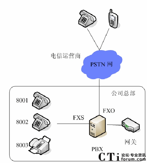 大多數(shù)公司目前都是使用PBX來提供電話業(yè)務(wù)的,PBX(小交換機)直接放置在在公司內(nèi)部,對內(nèi)直接布置分機,對外通過模擬中繼,與電信運營商的PSTN相連。