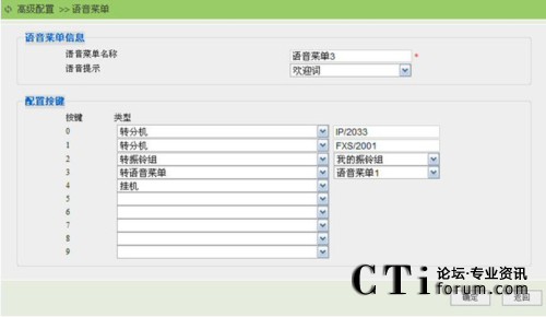 在此頁面可以定義語音菜單的名字,可以指定進(jìn)入此菜單后播放的音樂,還可以為每個鍵選擇合適的操作。支持0-9數(shù)字按鍵定義,每個鍵可選擇如下五個動作之一: