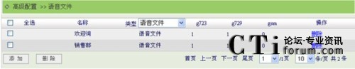 點擊“高級配置”菜單的“語音文件”子菜單,進(jìn)入語音文件頁面,在類型選項中可以選擇顯示語音文件或音樂保持文件,語音文件指的是語音菜單、振鈴組等業(yè)務(wù)使用的語音文件;音樂保持文件指的是呼叫保持,三方通話等業(yè)務(wù)用戶聽到的音樂保持文件。如下圖所示: