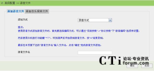 點擊“添加”鏈接按鈕,進(jìn)入語音文件添加頁面,用戶可以選擇上傳方式或者錄音方式來添加語音文件。如下圖所示: