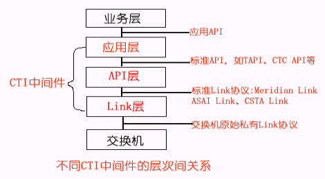 根據(jù)CTI的功能定位,我們可以把CTI產(chǎn)品劃分為不同的層次,一般地可分為三種類型:Link層產(chǎn)品、API層產(chǎn)品、應用層產(chǎn)品,其分層結構示意圖如下所示: