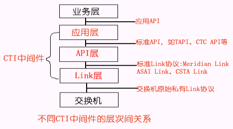 根據(jù)CTI的功能定位,我們可以把CTI產(chǎn)品劃分為不同的層次,一般地可分為三種類型:Link層產(chǎn)品、API層產(chǎn)品、應用層產(chǎn)品,其分層結(jié)構(gòu)示意圖如下所示: