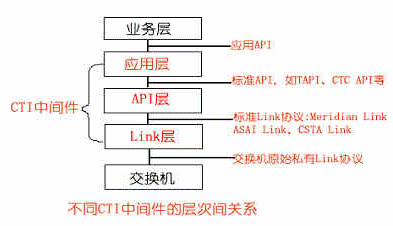 根據(jù)CTI的功能定位,可以把CTI產(chǎn)品劃分為不同的層次,一般地可分為三種類型:Link層產(chǎn)品、API層產(chǎn)品、應用層產(chǎn)品,其分層結(jié)構(gòu)示意圖如下所示: