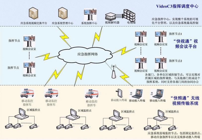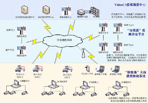 C3I視頻應(yīng)急指揮協(xié)同系統(tǒng)在政府IP網(wǎng)絡(luò)中處于城市的神經(jīng)中樞。它將政府各個(gè)部門、單位聯(lián)系成為一個(gè)整體。在C3I視頻應(yīng)急指揮協(xié)同系統(tǒng)的前端,由"快照通"無線視頻傳輸系統(tǒng)對(duì)政府所屬各個(gè)單位進(jìn)行實(shí)時(shí)監(jiān)控,時(shí)刻掌握現(xiàn)場動(dòng)態(tài),該部分支持固定點(diǎn)監(jiān)控,也支持移動(dòng)指揮點(diǎn)和無線移動(dòng)接入終端,保證了前方工作的靈活、機(jī)動(dòng)性;在系統(tǒng)的指揮中心部分,由VideoC3指揮調(diào)度中心來支持,它一方面需要對(duì)前端的監(jiān)控信息進(jìn)行控制,同時(shí),要對(duì)整個(gè)政府進(jìn)行綜合管理調(diào)度,在發(fā)生突發(fā)狀態(tài)的時(shí)刻,現(xiàn)場前端"快照通"捕獲的相應(yīng)信息通過C3I系統(tǒng)平臺(tái),迅速傳遞至指揮中心部分,政府管理人員通過VideoC3指揮調(diào)度中心對(duì)前端進(jìn)行遠(yuǎn)程指揮,在第一時(shí)間緊急處理現(xiàn)場突發(fā)事件;在整個(gè)C3I系統(tǒng)中,政府各個(gè)部門、單位之間通過"快視通"視頻會(huì)議平臺(tái)進(jìn)行辦公交流,支持各部門間的協(xié)同辦公,同時(shí),也可以通過其實(shí)現(xiàn)對(duì)所屬區(qū)域的指揮調(diào)度。