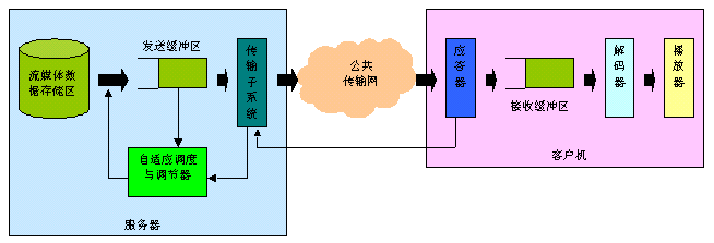 實時自適應(yīng)網(wǎng)絡(luò)帶寬的流媒體傳送技術(shù),是上海清鶴數(shù)碼科技公司的一項可大幅提高流媒體寬帶傳送過程中的關(guān)鍵服務(wù)質(zhì)量瓶頸的國際技術(shù)專利。我們知道,目前制約流媒體寬帶應(yīng)用發(fā)展的核心問題在于服務(wù)質(zhì)量。簡單地說,由于因特網(wǎng)的狀況是不可靠的,其帶寬、負(fù)荷等變化劇烈,這難以滿足流媒體寬帶業(yè)務(wù)的實時性服務(wù)質(zhì)量要求,并常常造成播放卡殼、延遲、視頻質(zhì)量抖動劇烈等不良情況,給使用者感官造成很大影響。所以解決好流媒體寬帶應(yīng)用的服務(wù)質(zhì)量問題對于流媒體寬帶應(yīng)用是極為重要的。如圖1所示,在一般的流媒體寬帶系統(tǒng)里,視頻服務(wù)器通過網(wǎng)絡(luò)向客戶機(jī)實時傳送流媒體信息。