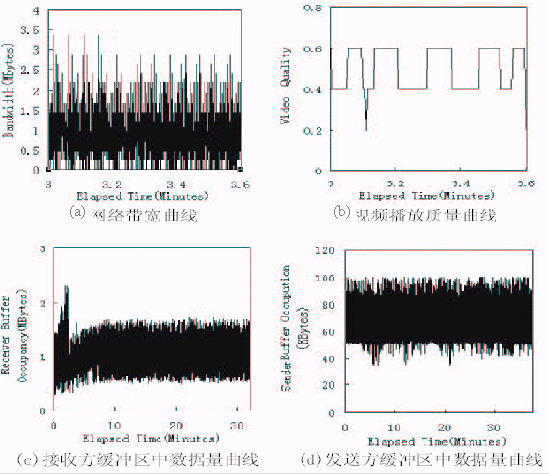 圖3給出了在劇烈的帶寬變化情況下,應(yīng)用該技術(shù)的視頻點播系統(tǒng)所達(dá)到的性能。在圖3中,(a)表示所使用的帶寬情況;(b)表示客戶端得到的視頻播放質(zhì)量;(c)和(d)分別表示在播放過程中接收緩沖區(qū)和發(fā)送緩沖區(qū)中的數(shù)據(jù)量情況。對比圖3(a)(b)可以看出,在網(wǎng)絡(luò)帶寬劇烈變化的情況下,視頻播放質(zhì)量的變化很平緩。由圖3(c)知,接收方緩沖區(qū)沒有發(fā)生上溢或下溢,這表明客戶始終能享受到連續(xù)的視頻播放,沒有出現(xiàn)播放卡殼;也沒有出現(xiàn)因為緩沖區(qū)上溢而丟失從網(wǎng)絡(luò)傳過來的數(shù)據(jù)。圖3(d)則表明發(fā)送緩沖區(qū)始終在80k字節(jié)左右,沒有發(fā)生下溢,說明數(shù)據(jù)發(fā)送模塊始終有數(shù)據(jù)可發(fā),即網(wǎng)絡(luò)帶寬得到了充分利用。