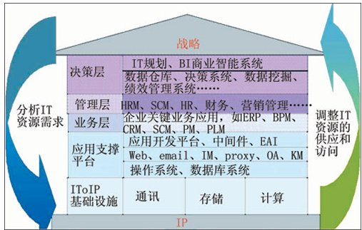 按照華為3Com的構(gòu)想,如果把整個(gè)IT系統(tǒng)比做一座房屋,那么整個(gè)房屋的地基就是IP網(wǎng)絡(luò),需要基于IP網(wǎng)絡(luò)來(lái)構(gòu)建通信、存儲(chǔ)、計(jì)算等IT基礎(chǔ)設(shè)施。在這些基礎(chǔ)設(shè)施之上,則是應(yīng)用支撐平臺(tái)(操作系統(tǒng)、數(shù)據(jù)庫(kù)系統(tǒng)、應(yīng)用開發(fā)平臺(tái)等),基于應(yīng)用支撐平臺(tái)提供給機(jī)構(gòu)的關(guān)鍵業(yè)務(wù)流程信息系統(tǒng)(如ERP、SCM等),最終為用戶的管理和決策提供支持。“在戰(zhàn)略與IT基礎(chǔ)設(shè)施之間實(shí)現(xiàn)實(shí)時(shí)同步互動(dòng),IT為用戶高層提供商業(yè)智能系統(tǒng)、決策系統(tǒng),以便決策層即時(shí)掌握信息,作為機(jī)構(gòu)戰(zhàn)略決策、戰(zhàn)略挑戰(zhàn)的依據(jù);用戶可以依據(jù)內(nèi)、外部變化,進(jìn)行戰(zhàn)略調(diào)整時(shí)快速分析新的IT資源需求,同步調(diào)整IT資源的配置,從而使IT與業(yè)務(wù)戰(zhàn)略保持同步!边@正是IToIP的基本理念。