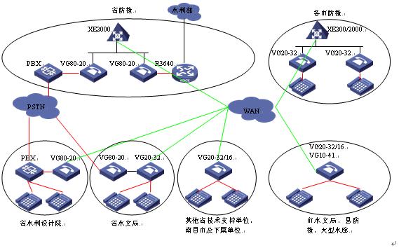 省水文局采用VG20-32堆疊接入模擬電話。同時(shí)采用VG80-20出1個(gè)E1接口連接PSTN。