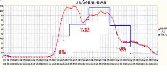 大家看到圖一中紅色的線,就是一天里面電話進來的數量,藍色的線是安排的人力?梢郧宄吹剑涸缟8點一開始,電話就一直進來;中午來電的客戶開始去吃飯,電話就開始下滑;然后等到客戶吃完中飯,電話又開始進來,下午又出現另外一個高峰;一直到5點以后又開始下滑,6點以后電話相對就少很多。