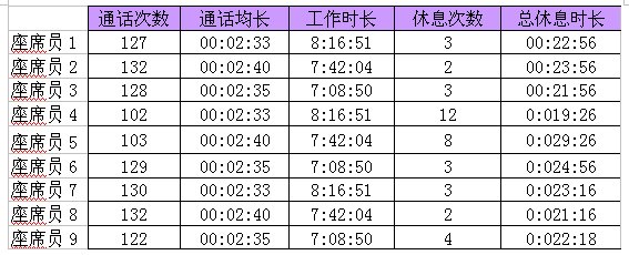 上面這張表格,畫出的就是9個(gè)座席員的話務(wù)數(shù)據(jù)情況,分別列出了通話次數(shù)、通話均長(zhǎng)、工作時(shí)長(zhǎng)、休息次數(shù)、總休息時(shí)長(zhǎng)這五個(gè)KPI指標(biāo),你可以看的出來是哪一個(gè)座席員在呼攸嗎?