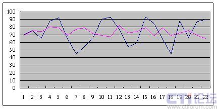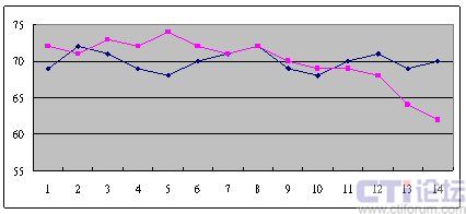 這是兩個座席員每天的通話利用率,橫軸是這個月從月初到月末,縱軸是通話利用率,藍色這位的平均通話利用率在70左右,粉紅色這位的平均通話利用率也是在70左右,但上下震蕩的很厲害,月初表現的很好,但從月中開始,通話利用率就一直明顯的下降。