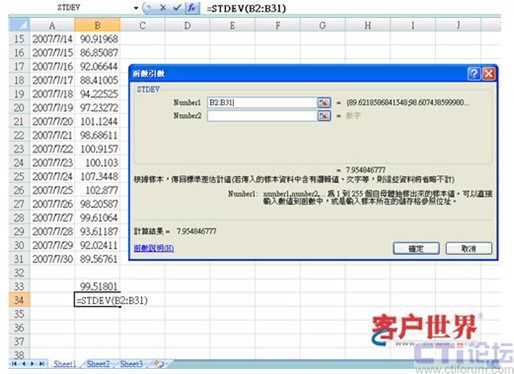 標準差計算方法很簡單,在EXCEL里面,只要利用“STDEV”函數,選中你要計算標準差的數列,如下圖,我們要計算7月1號到30號平均處理時長的標準差,7月1號到30號平均處理時長的數據,就是B2到B31這數列,只要選中這數列,按“確定”,就會得出標準差。