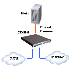 下圖顯示了一個(gè)小容量iSX4000 UAP系統(tǒng),該系統(tǒng)由一臺(tái)iSX4000 交換機(jī)和一臺(tái)主機(jī)服務(wù)器構(gòu)成,主機(jī)上運(yùn)行所有的軟件,包括主控軟件、用戶應(yīng)用程序和