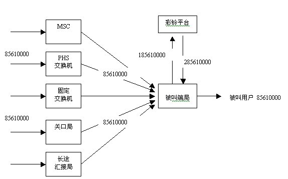 - 彩鈴平臺(tái)在收到"彩鈴平臺(tái)號碼前綴+原被叫號碼"的呼叫后,分析出業(yè)務(wù)用戶(被叫號碼),在彩鈴平臺(tái)上進(jìn)行相關(guān)的業(yè)務(wù)處理,然后在被叫號碼前加一個(gè)另外的號碼前綴(稱作"接通被叫指示前綴"),被叫號碼成了"前綴2+原被叫號碼"(避免被叫端局的二次觸發(fā)),彩鈴平臺(tái)把這個(gè)新被叫號碼接續(xù)回到被叫交換機(jī);