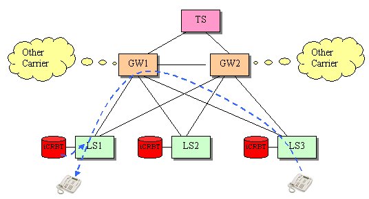 圖5 每個(gè)端局交換機(jī)配置一套iCRBT系統(tǒng)(有迂回)
