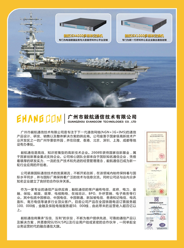 廣州市毅航通信技術(shù)有限公司是專注于下一代通信網(wǎng)絡(luò)(NGN+3G)的通信產(chǎn)品設(shè)計、研發(fā)、銷售以及整體解決方案的供應(yīng)商。