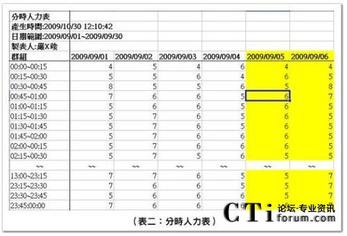 分時人力表在管理上有重要的地位,用于檢視時間內(nèi)排定的出席人數(shù),通常是將此數(shù)據(jù)與預(yù)測的話務(wù)需求做比對,檢查排定人力數(shù)與話務(wù)曲線的擬合度。在現(xiàn)場管理時,則用于小休調(diào)度,避免小休人數(shù)過多,使出席人數(shù)降到關(guān)鍵少數(shù)的臨界點(diǎn)下,造成服務(wù)水平大幅跌落的狀況發(fā)生。