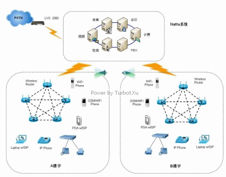 如果當(dāng)整個(gè)樓宇被WiFi網(wǎng)絡(luò)覆蓋,用戶(hù)可通過(guò)WiFi Phone或支持WiFi功能的PDA手機(jī)注冊(cè)到Netta交換系統(tǒng),如使用有線(xiàn)網(wǎng)絡(luò),用戶(hù)可通過(guò)Gateway