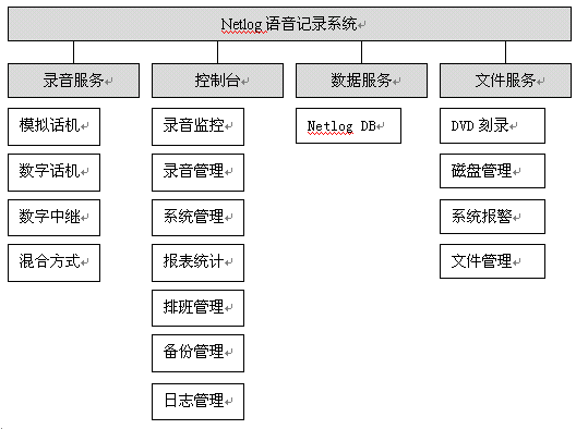 NetLog語音記錄系統(tǒng)采用基于分布式、多層控制管理體系的設(shè)計(jì)思想,將電話線路與內(nèi)部網(wǎng)絡(luò)有效地結(jié)合在一起,形成一套完整的語音錄制、管理系統(tǒng)。采用目前先進(jìn)的C/S模型,能更方便、快捷地實(shí)現(xiàn)控制臺(tái)對(duì)網(wǎng)絡(luò)內(nèi)所有記錄服務(wù)的狀態(tài)監(jiān)視,記錄查詢,操作控制等,采用統(tǒng)一的管理化機(jī)制,使文件的管理和備份更簡(jiǎn)潔。