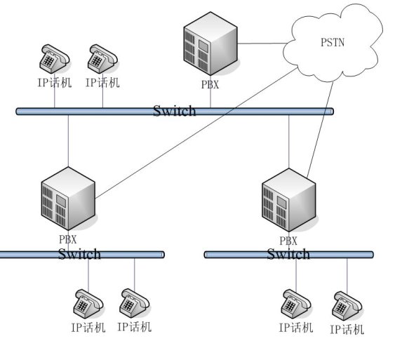 - 普通網(wǎng)絡(luò)結(jié)構(gòu):適用用于中型企業(yè)。在不同地域有公司分部,各分部之間通訊需要通過PSTN,每個(gè)分部都有自己的PBX。相對于每個(gè)分部而言,采用的是簡單網(wǎng)絡(luò)結(jié)構(gòu)。