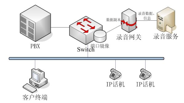 NETLOG VOIP語音記錄系統(tǒng)采用端口鏡像技術(shù),在要錄音網(wǎng)絡(luò)的PBX上將所有的數(shù)據(jù)包生成一個(gè)副本,在不影響主線傳輸?shù)幕A(chǔ)上,把副本傳送到錄音網(wǎng)關(guān)RG(Record