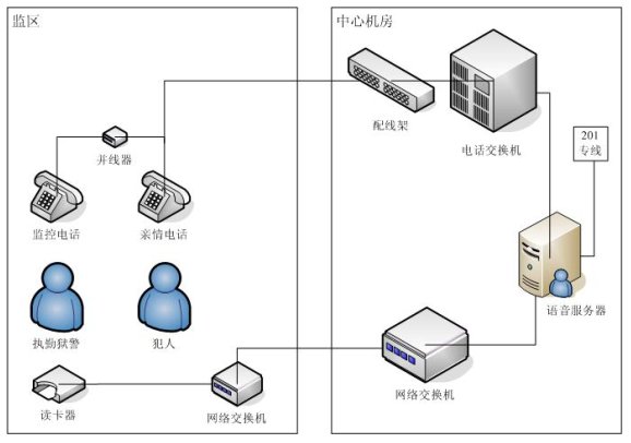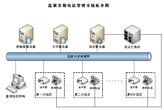 親情電話管理系統(tǒng)在系統(tǒng)設(shè)計中充分考慮監(jiān)獄的需求與特點,不但包含了一般親情電話錄音所需的全部功能,而且還融合了獄政管理的功能,整個系統(tǒng)采用集中式方式,在中心機房部署一套親情電話錄音服務器,各個監(jiān)區(qū)監(jiān)控系統(tǒng)利用監(jiān)獄內(nèi)部的局域網(wǎng)聯(lián)結(jié)成一個整體,形成一個能監(jiān)控監(jiān)獄親情電話的全網(wǎng)。這樣即可以在每個監(jiān)區(qū)監(jiān)聽,也可以在監(jiān)獄內(nèi)部網(wǎng)的任何地方對親情電話進行全程監(jiān)視。該系統(tǒng)能夠完全滿足目前監(jiān)獄的需求,產(chǎn)品性價比遠遠高于市場上其他同類產(chǎn)品。