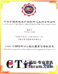 客戶聯(lián)絡(luò)中心標(biāo)準(zhǔn)委員會(huì)層層評(píng)估和共同審定,上海寶東(DataTool)及VERINT雙雙獲得“2009中國呼叫中心排班管理軟件獎(jiǎng)”,這一大獎(jiǎng)的頒發(fā)是ICMI對寶東及VERINT的肯定與支持,代表著權(quán)威機(jī)構(gòu)對VERINT的WFM排班管理軟件在呼叫中心行業(yè)中的貢獻(xiàn)及對寶東公司技術(shù)服務(wù)能力的認(rèn)可及肯定。