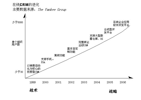 2005年是全球CRM市場發(fā)生天翻地覆變化的一年,CRM市場已達到120億美元規(guī)模(根據(jù)AMR數(shù)據(jù))。傳統(tǒng)應用軟件商們紛紛涉足應用軟件托管,但三心二意。傳統(tǒng)應用軟件巨頭Siebel,因客戶選擇其托管CRM而通常不會再買其高利潤的傳統(tǒng)CRM產(chǎn)品,其在市場推廣力度和技術服務水平上遠不如Salesforce,Siebel最后被Oracle收購。在Peoplesoft