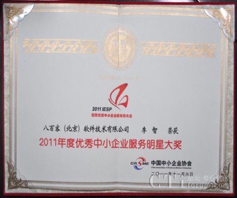 作為國內(nèi)首家SaaS廠商,八百客積極推動云計(jì)算在中小企業(yè)中的宣傳與運(yùn)用。2006年,八百客在國內(nèi)率先推出管理自動化開發(fā)平臺800APP, 它擴(kuò)展了按需服務(wù),并實(shí)現(xiàn)了客戶可根據(jù)需要自定制應(yīng)用程序,成為了改變應(yīng)用程序開發(fā)的一個(gè)新途徑。為表彰八百客在中小企業(yè)信息化中做出的杰出貢獻(xiàn),本次大會特別為八百客頒發(fā)了“2011年度優(yōu)秀中小企業(yè)服務(wù)產(chǎn)品大獎(jiǎng)”,此外還授予八百客總經(jīng)理李智 “2011年度優(yōu)秀中小企業(yè)服務(wù)明星大獎(jiǎng)”。
