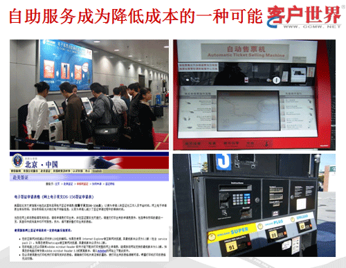 我想自助服務(wù)成為降低成本的一種手段已經(jīng)不是什么新話題。我這次去美國,感觸特別深刻,今天的華盛頓機場,當(dāng)你去UA柜臺check in的時候已經(jīng)幾乎沒有人了,基本靠自助服務(wù),你自己check in,自己把行李條貼上。我們?nèi)ッ绹笫桂^辦簽證,他們只收電子表格的申請。什么是電子表格,就是你得在美國大使館網(wǎng)站上把你的信息輸進(jìn)去,等于你幫助美國大使館節(jié)約了輸入費用。我想今天無論在上海還是北京,在中國很多行業(yè)已經(jīng)開始使用自助手段,我們無法逃避這樣一個現(xiàn)實。