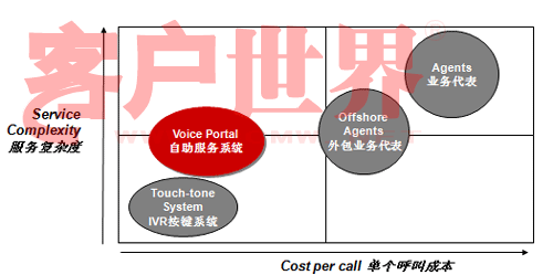 讓我們來看看這張圖。這張圖縱軸是服務(wù)的復(fù)雜度,橫軸是單位呼叫成本,傳統(tǒng)的IVR(觸鍵的語音IVR)和人工服務(wù)相比,服務(wù)的復(fù)雜度可就差多了。而Voice Portal的概念是用比較少的成本做更多的業(yè)務(wù),從成本上講比原來的傳統(tǒng)的IVR可能成本稍微高一點點,但是和人工服務(wù)相比,無論是和單位自建呼叫中心座席比,還是和外包呼叫中心座席比,成本都有很大降低,但業(yè)務(wù)復(fù)雜度可以做得比傳統(tǒng)IVR復(fù)雜很多。我們承認(rèn),就提供服務(wù)的內(nèi)容來講,Voice Portal今天仍然不能夠像人工那樣提供那么全面的服務(wù),但是可以涵蓋很多服務(wù)內(nèi)容,在這方面一是因為技術(shù)先進(jìn)了,另一方面也在于引導(dǎo)。今天我看到越來越多的客戶已經(jīng)開始有意識的推行自助服務(wù)形式。我前幾年去新加坡打出租,發(fā)現(xiàn)在新加坡有很多叫出租的車站,車站上有一個按鍵,按鍵上有一個編碼,說明你在什么位置,當(dāng)你打通出租車客服的電話,你只要告訴這個編碼,他們就自然而然知道你在什么地方,并把要來接你的車車牌號通過語音報讀方式通知你。今天在中國也開始有這種形式了。昨天我沒有開車,也算是支持北京市每周少開一天車的號召,我打了出租,在和出租司機聊天的過程中,出租司機說現(xiàn)在油價很貴,他們有很強烈的需求不愿意掃馬路,他們也有一個出租車叫車電話,那個呼叫中心大概有上百個坐席,這個公司有一萬六千輛出租車在北京,由他們來進(jìn)行搶答,搶答完之后你可以告訴說這個人在什么地方等,唯一不同的我們在自助化上還沒有做得那么到位,司機搶到了活還要給客戶打一個電話,不象新加坡完全是自助的,你只要按了那個鍵,系統(tǒng)就知道你在什么地方,當(dāng)尋找到合適的車的時候,語音報讀你車牌號就行了。我和說出租車師傅,那你打電話成本不是增加了嗎,他一笑,增加打一個電話的成本怎么也比掃馬路強。大家可以看看呼叫中心多有用,自助服務(wù)能省多少錢。